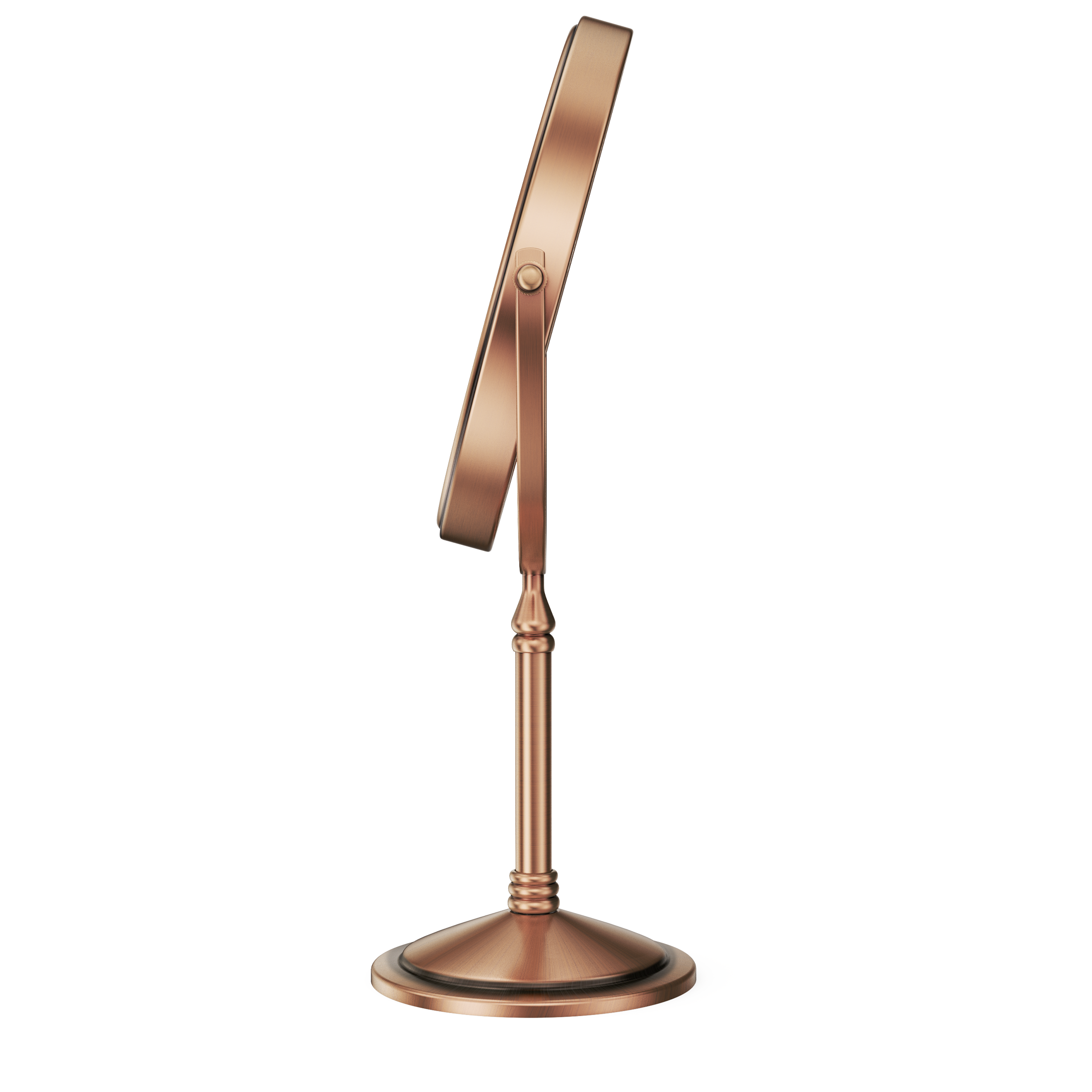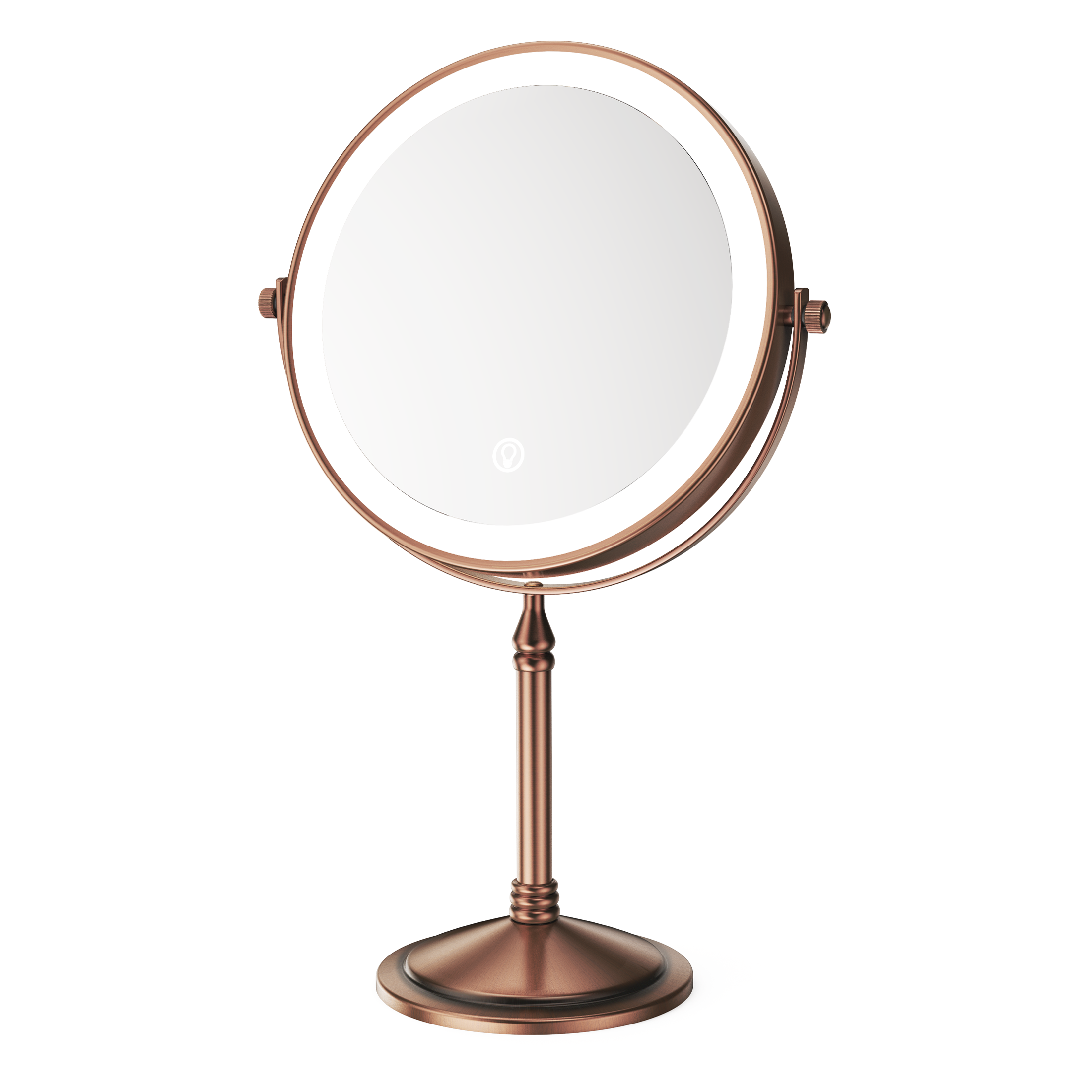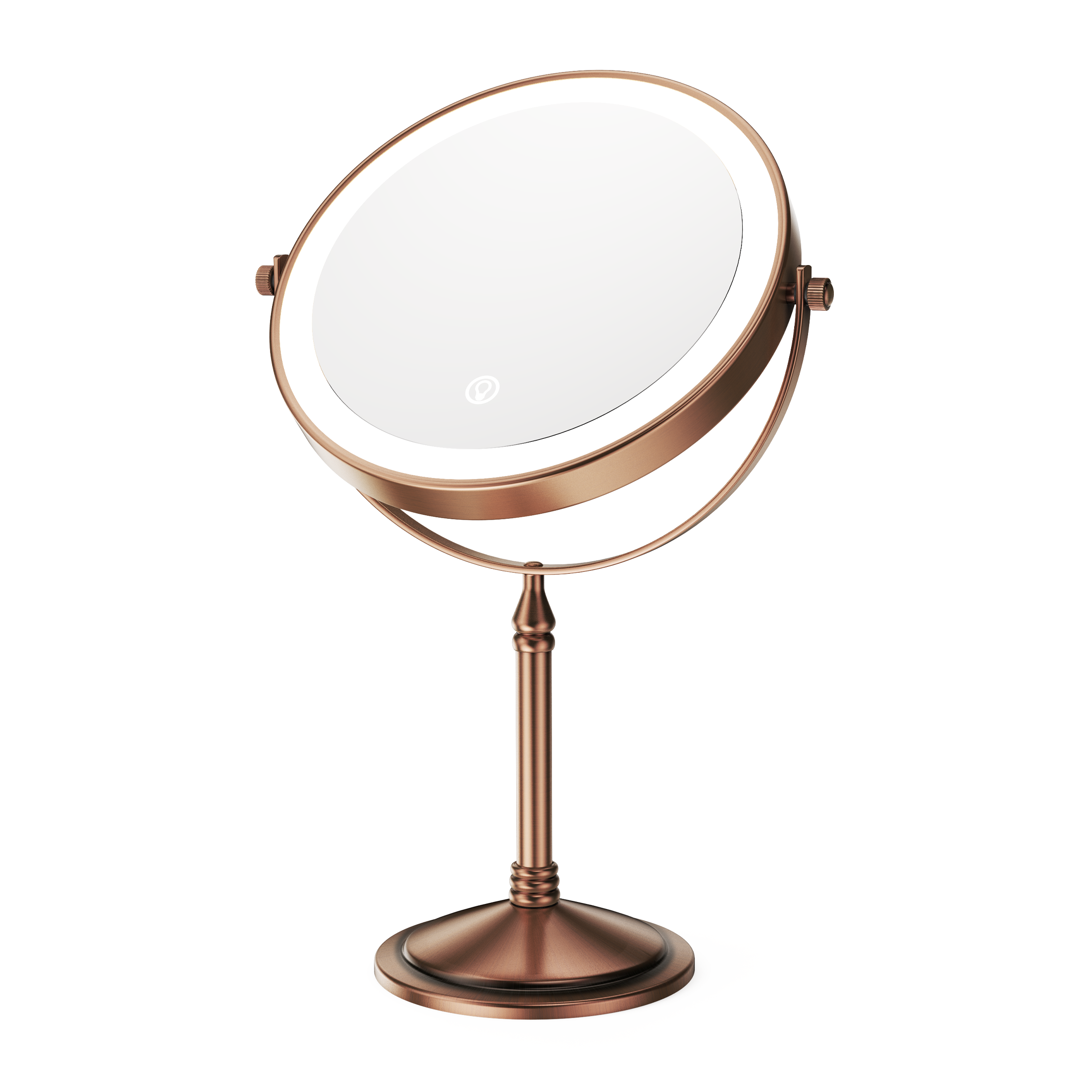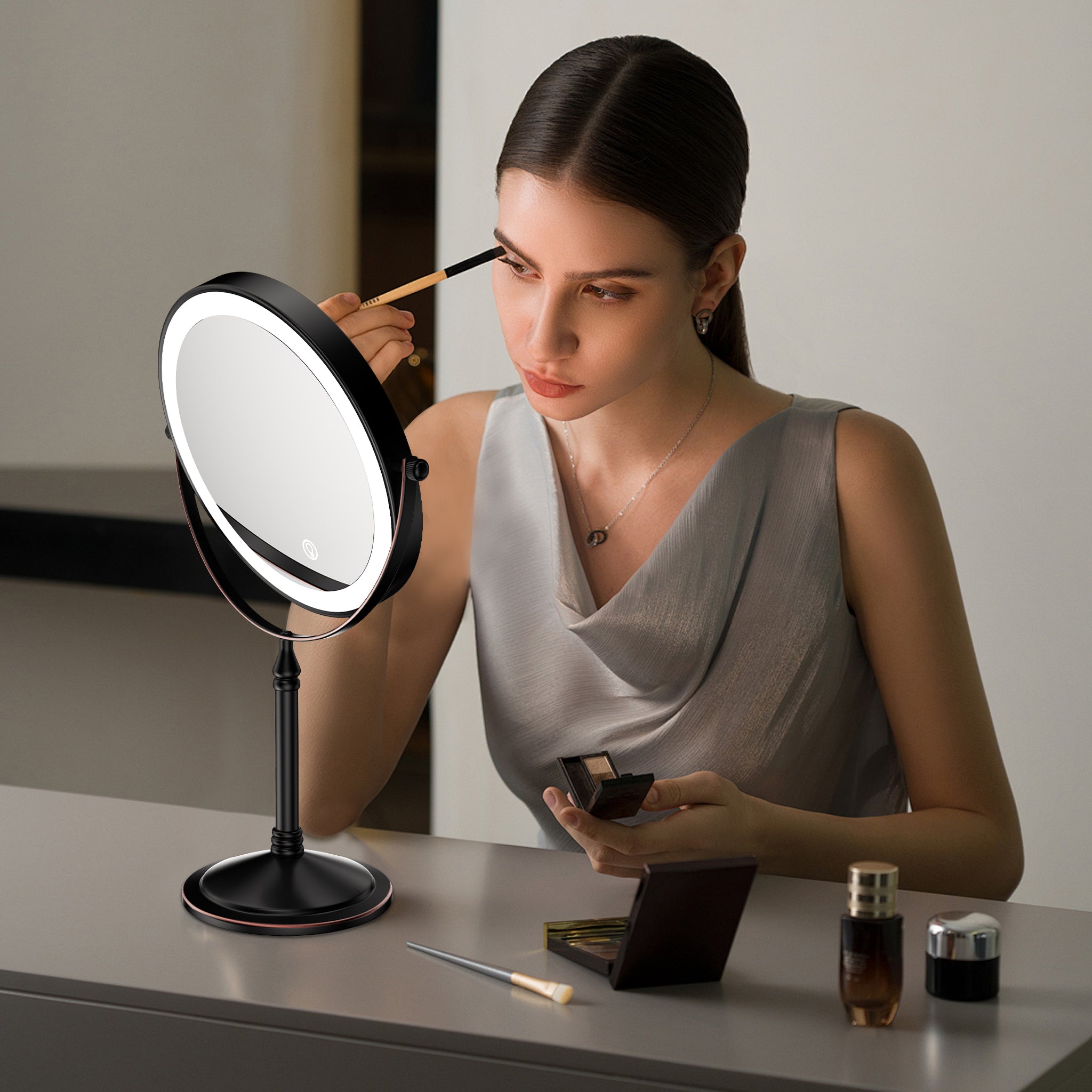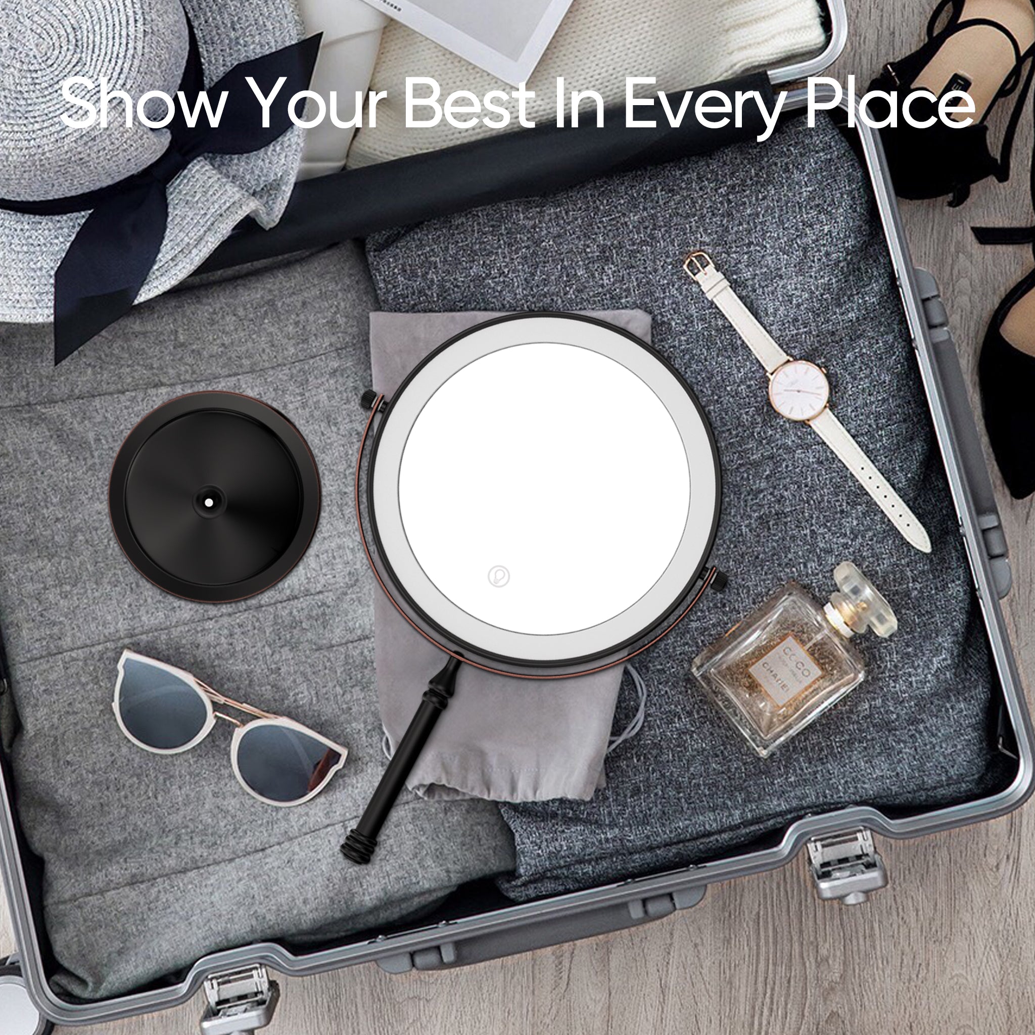 The base of this mirror screws off and makes it easy to pack it in your suitcase for travel. One side is normal mirror and the other offers 10x magnification for makeup application. Comes with recharging cord for the light that circles both sides of the mirror (you supply your own power brick). I like this for when I stay overnight and need a magnification mirror to put my contacts in, and this doesn't take up a lot of room and one charge before I leave will last me well over a week. Great mirror for the price. Also looks nice on the counter- metal is a rubbed bronze color.