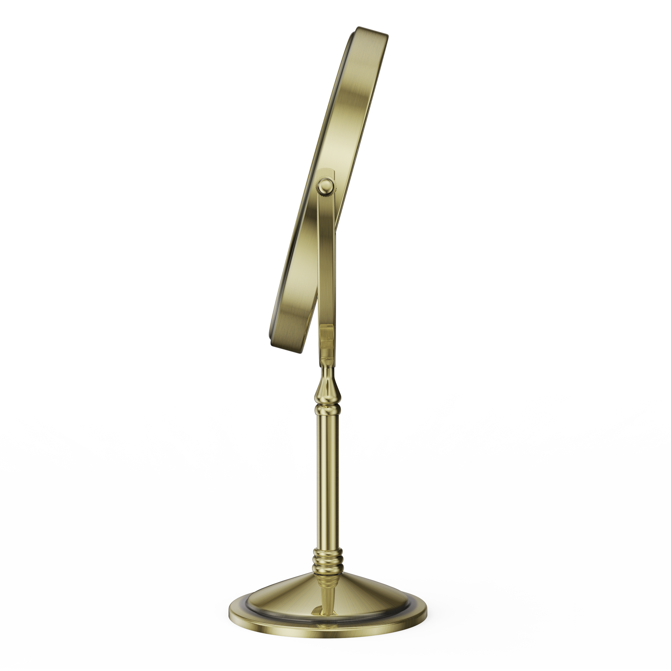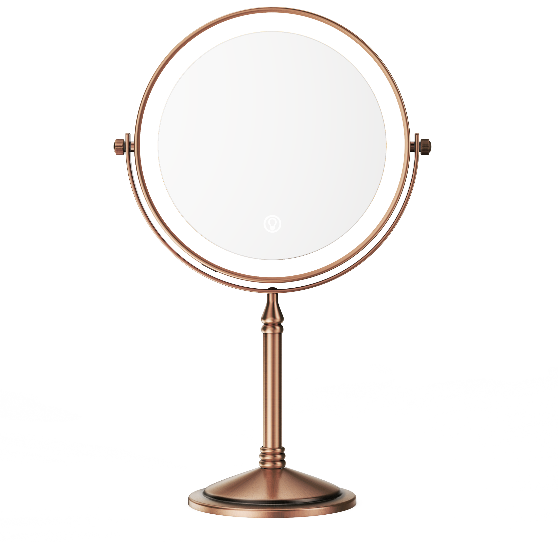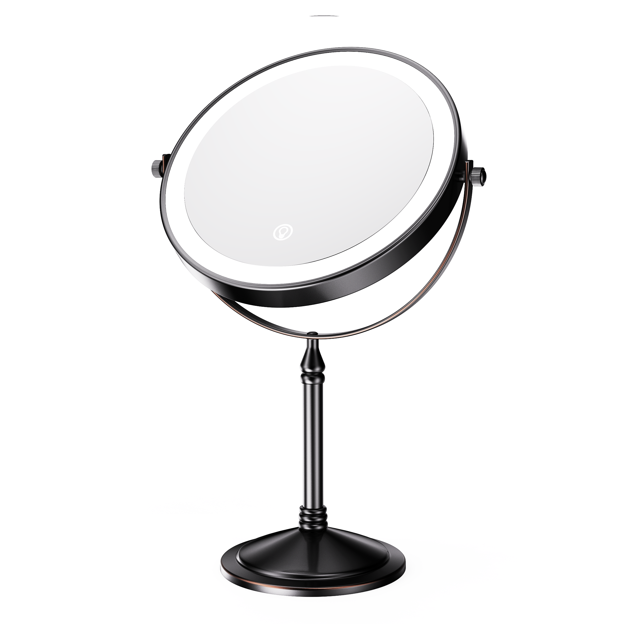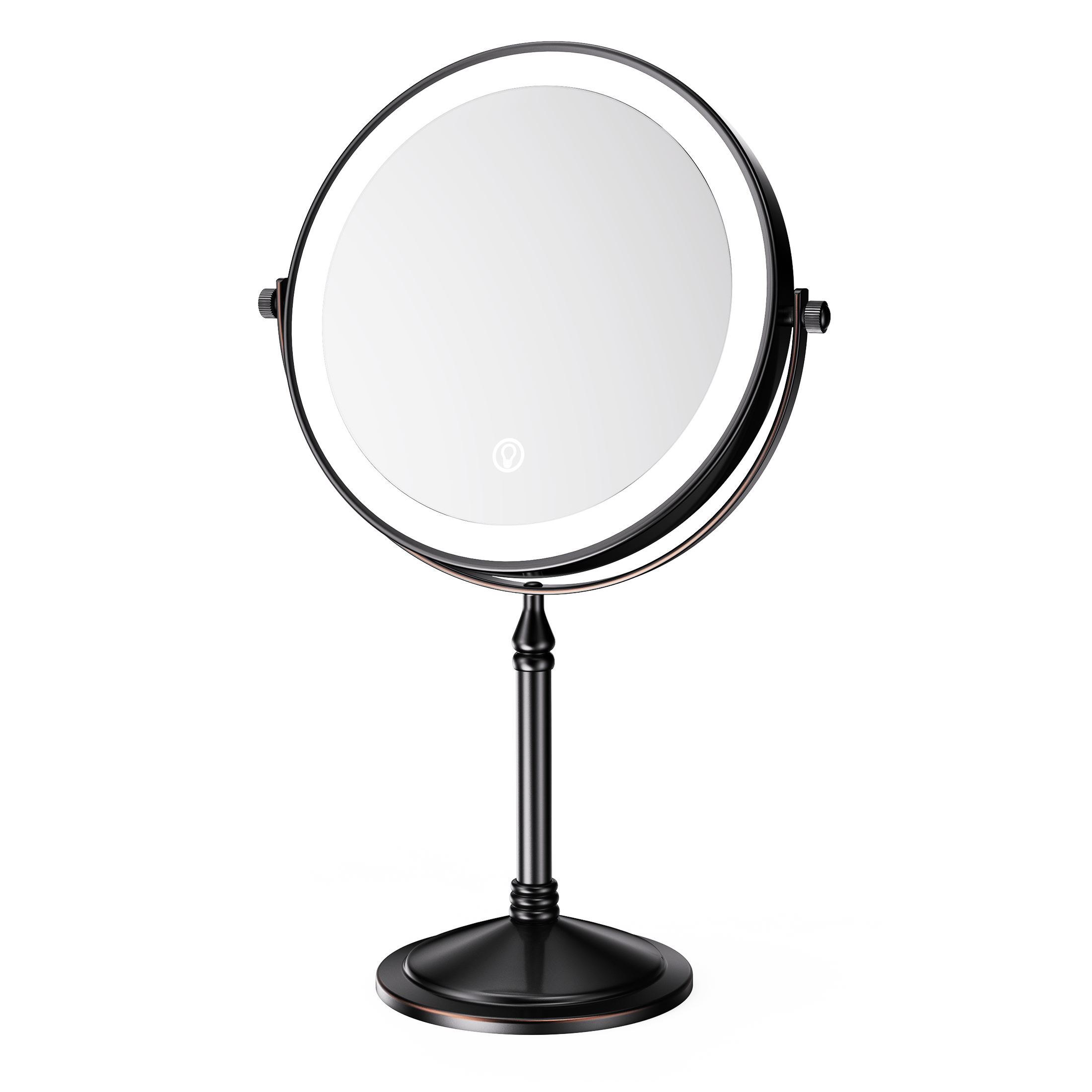 The base of this mirror screws off and makes it easy to pack it in your suitcase for travel. One side is normal mirror and the other offers 10x magnification for makeup application. Comes with recharging cord for the light that circles both sides of the mirror (you supply your own power brick). I like this for when I stay overnight and need a magnification mirror to put my contacts in, and this doesn't take up a lot of room and one charge before I leave will last me well over a week. Great mirror for the price. Also looks nice on the counter- metal is a rubbed bronze color.
