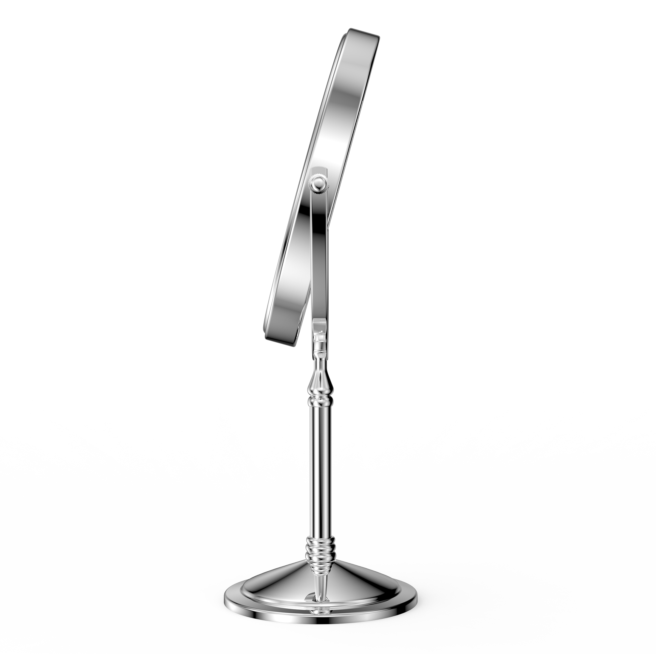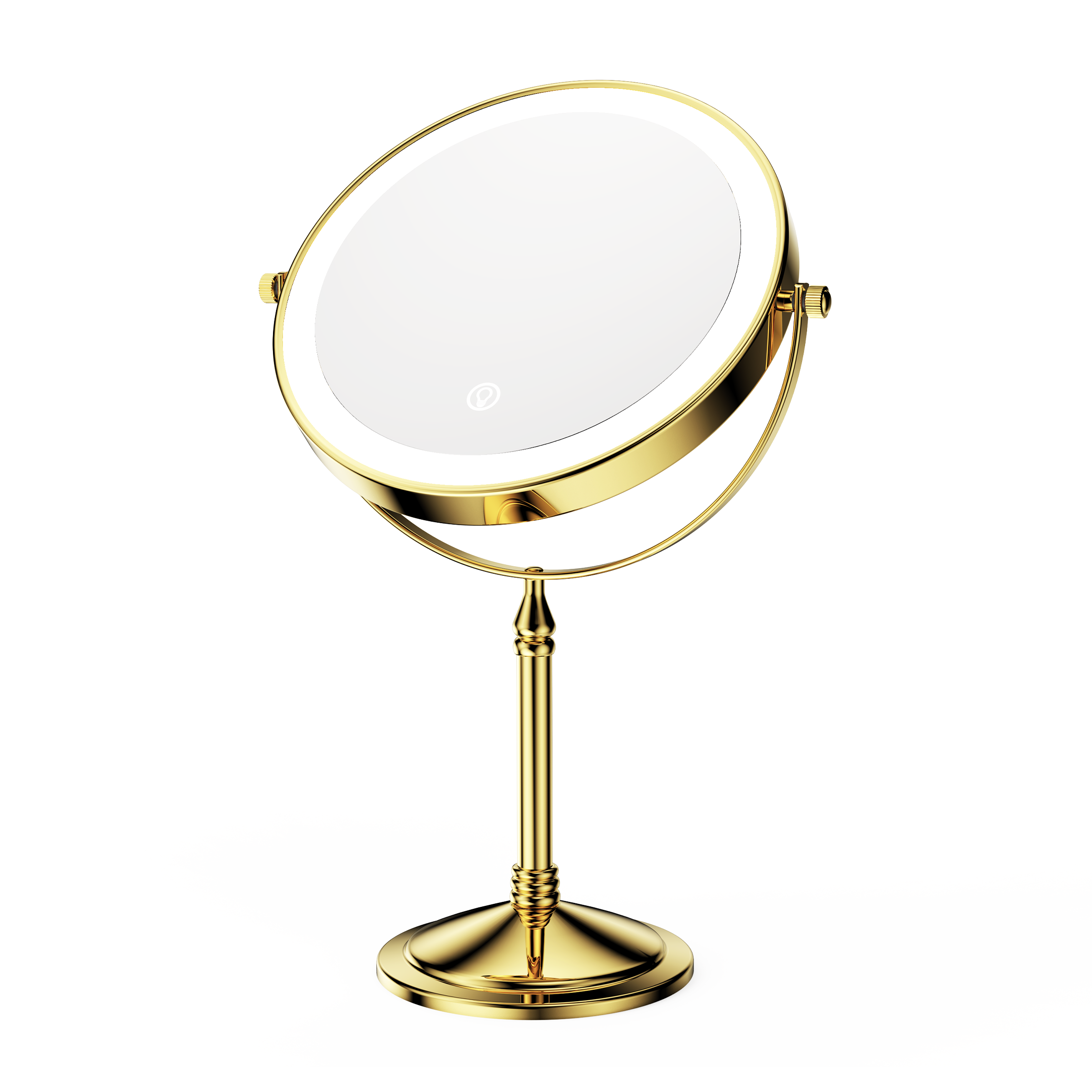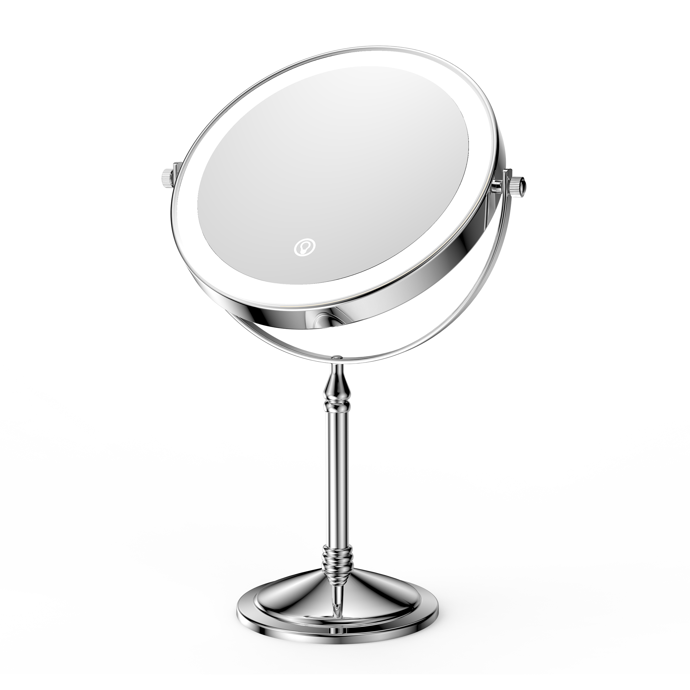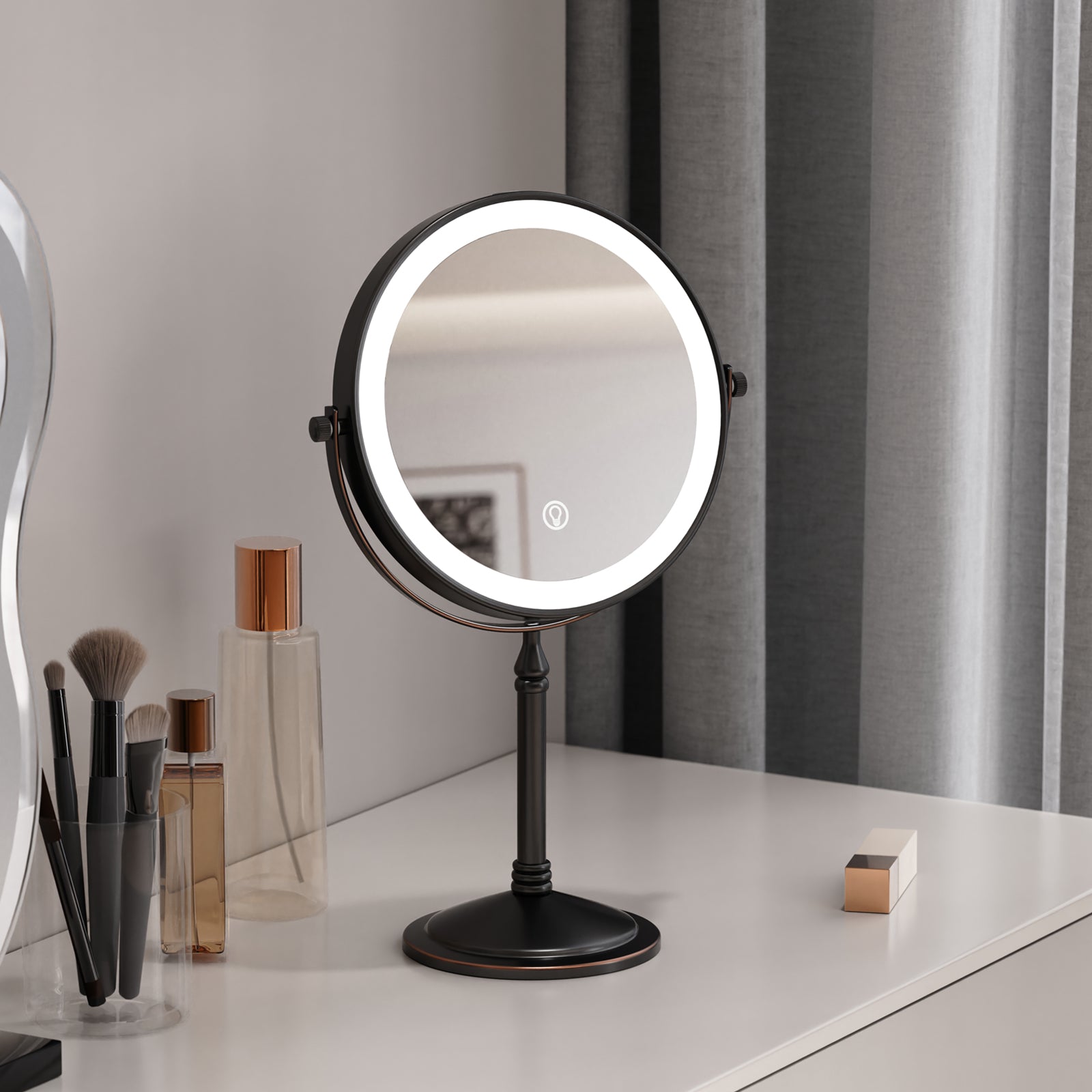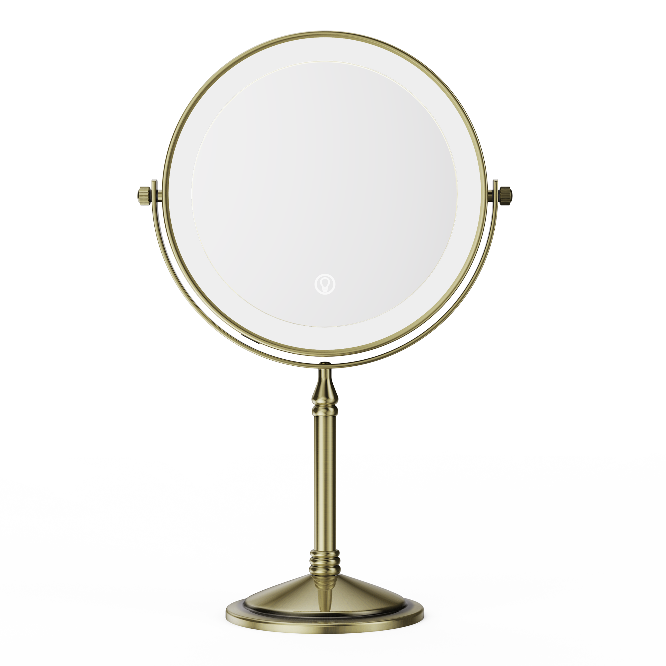 The base of this mirror screws off and makes it easy to pack it in your suitcase for travel. One side is normal mirror and the other offers 10x magnification for makeup application. Comes with recharging cord for the light that circles both sides of the mirror (you supply your own power brick). I like this for when I stay overnight and need a magnification mirror to put my contacts in, and this doesn't take up a lot of room and one charge before I leave will last me well over a week. Great mirror for the price. Also looks nice on the counter- metal is a rubbed bronze color.