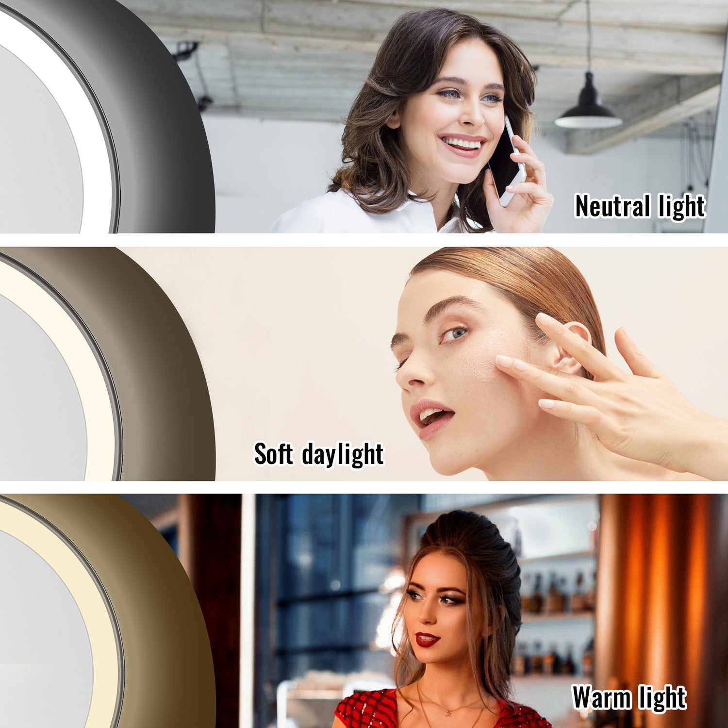 Designed to meet various lighting needs, the three adjustable light color settings can be easily switched, helping your makeuplook more accurate and natural, effortlessly adapting to different occasions